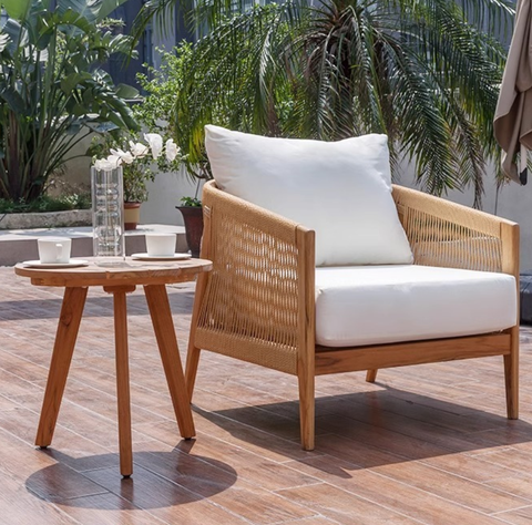 เก้าอี้และโต๊ะกาแฟแบบผูกเชือกโซฟาไม้สักสำหรับแขกในโรงแรมเก้าอี้สำหรับพักผ่อนกลางแจ้ง